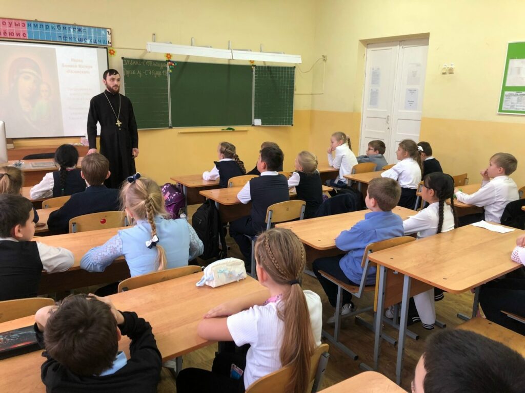 6 ноября священник Димитрий Сычев провел урок у 3Б класса в МАОУ СОШ №9. Отец Димитрий рассказал детям об истории праздника в честь Казанской иконы Божией Матери и его значении для верующих россиян, а также о других православных осенних праздниках.